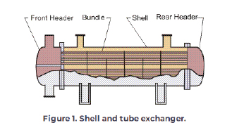A shell and tube exchanger consists of a number of tubes mounted inside a cylindrical shell. Figure 1 illustrates a typical unit that may be found in a petrochemical plant. Two fluids can exchange heat, one fluid flows over the outside of the tubes while the second fluid flows through the tubes. The fluids can be single or two phase and can flow in a parallel or a cross/counter flow arrangement.
