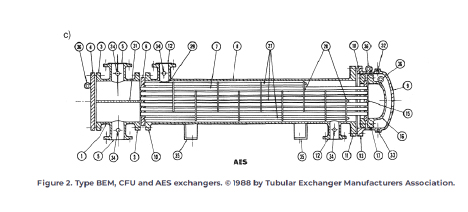 The popularity of shell and tube exchangers has resulted in a standard nomenclature being developed for their designation and use by the Tubular Exchanger Manufactures Association (TEMA). This nomenclature is defined in terms letters and diagrams. The first letter describes the front header type, the second letter the shell type and the third letter the rear header type. Figure 2 shows examples of a BEM, CFU, and AES exchangers while Figure 3 illustrates the full TEMA nomenclature.